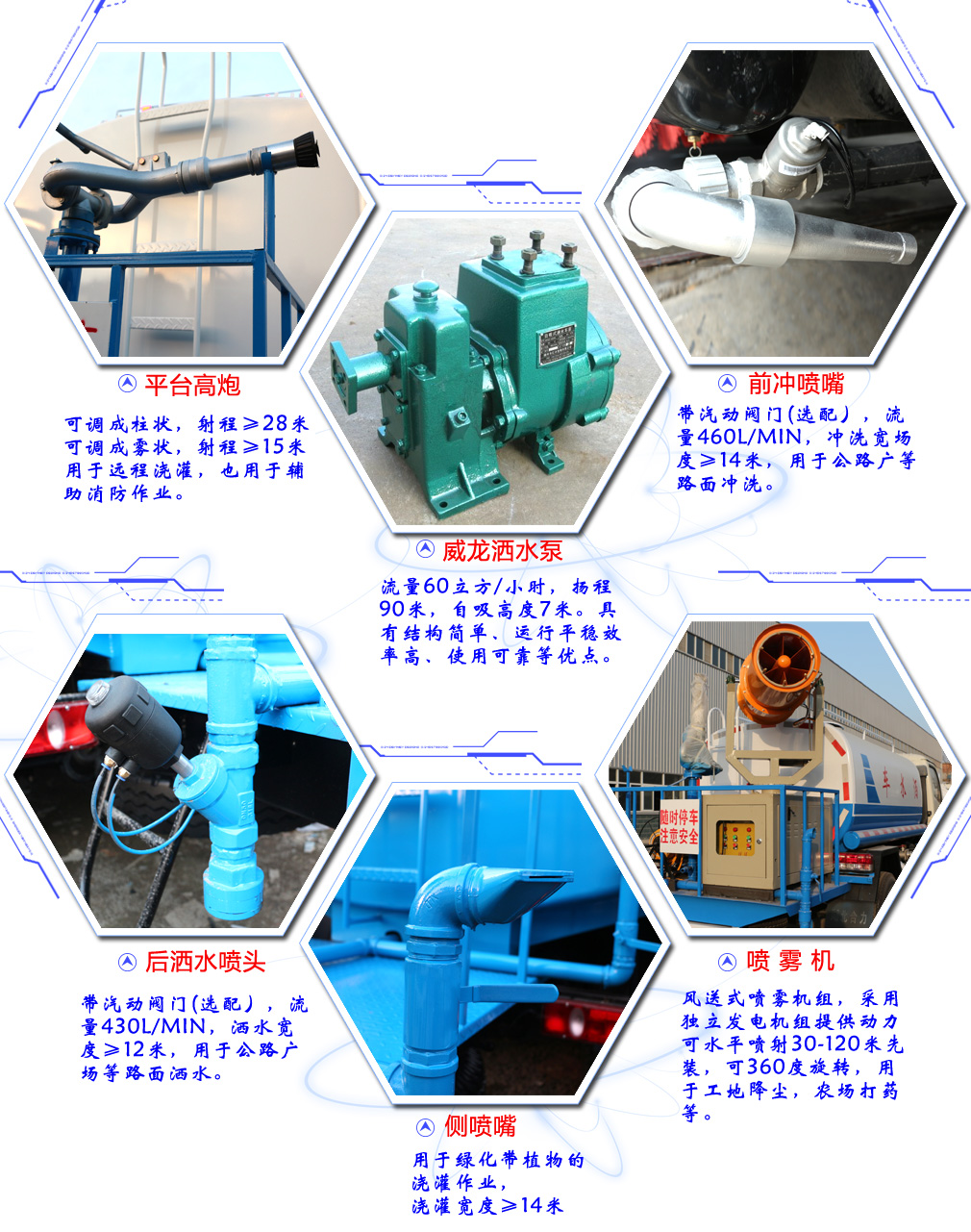 | 其他 | 1、運(yùn)輸介質(zhì)為:抑塵劑,密度:780千克/立方米.罐體有效容積9.90立方米;整車(chē)長(zhǎng)度(mm)、罐體外形尺寸(長(zhǎng)×長(zhǎng)軸×短軸)(mm)與軸距(mm)的對(duì)應(yīng)關(guān)系:8500/4000×2300×1500/4500, 8700/4200×2250×1450/4700,9000/4500×2200×1400/5000;2、防護(hù)材料:Q235碳鋼,連接方式:左右側(cè)面及后下部防護(hù)均采用焊接連接,后部防護(hù)斷面尺寸(mm):150×50,后部防護(hù)離地高度(mm):530。3、ABS型號(hào):3631010-C2000,4460046440;生產(chǎn)廠家:東科克諾爾商用車(chē)制動(dòng)系統(tǒng)(十堰)有限公司,威伯科汽車(chē)控制系統(tǒng)(中國(guó))有限公司。4、車(chē)輛顏色、文字噴涂及局部細(xì)節(jié)可變化;5、隨底盤(pán)選裝駕駛室。專用裝置:抑塵霧炮, 型號(hào):LM-40 廠家:湖北龍馬汽車(chē)裝備有限公司。 | ||
